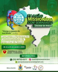 A Diocese de Araçuaí (MG) louva a Deus por sua bela história de testemunho e serviço ao Senhor nos Vales do Jequitinhonha, Mucuri e do Rio Pardo, por meio de uma evangelização missionária que brota da alegria do encontro com Jesus Cristo. Nesse espírito de gratuidade, com alegria e esperança, nos preparamos para vivenciar a nossa IV Ação Missionária com Seminaristas a realizar-se entre os dias 15 e 25 de janeiro de 2026, na cidade e comunidades rurais de Caraí (MG), paróquia São José. Participarão desta atividade missionária, além dos seminaristas, padres, diáconos, leigos e leigas. Os leigos/as da diocese de Araçuaí (MG) farão presença em Caraí especialmente entre os dias 22 e 25 de janeiro. Em comunhão com esta ação missionária todas as paróquias de nossa diocese desenvolverão atividades missionárias em suas comunidades.