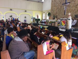 Ao retornarem para a Paróquia do Sagrado Coração de Jesus os participantes foram recebidos pelo bispo diocesano, Dom Manuel Parrado Carral, que presidiu a Santa Missa. Em sua homilia o bispo diocesano lembrou do compromisso missionário das crianças e jovens. “Queridos adolescentes e crianças, membros da Infância e Adolescência Missionária, Jesus os ama muito e conta com vocês para fazer chegar a todas as crianças e adolescentes do mundo sua mensagem de amor e de paz. Como bispo desta diocese eu também conto com vocês na ação missionária evangelizadora em nossas comunidades e em todo o lugar de nossa diocese, pois, onde vocês estiverem aí estará o pequeno missionário para falar de Jesus e para testemunhar por sua maneira de ser e de agir a pessoa de Jesus Cristo.”, destacou Dom Manuel.
