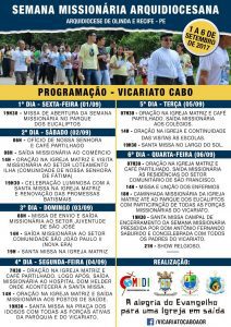 Com o tema “A alegria do Evangelho para uma Igreja em saída”, e o lema: “Meu espírito exulta em Deus, meu Salvador” (Lc 1, 47), a arquidiocese de Olinda e Recife em Pernambuco inicia hoje, 1 de setembro, a Semana Missionária em suas oito regiões episcopais. A iniciativa que se estende até o dia 6, visa intensificar a preparação da arquidiocese que acolher o 4º Congresso Missionário Nacional (4º CMN), nos dias 7 a 10 de setembro.